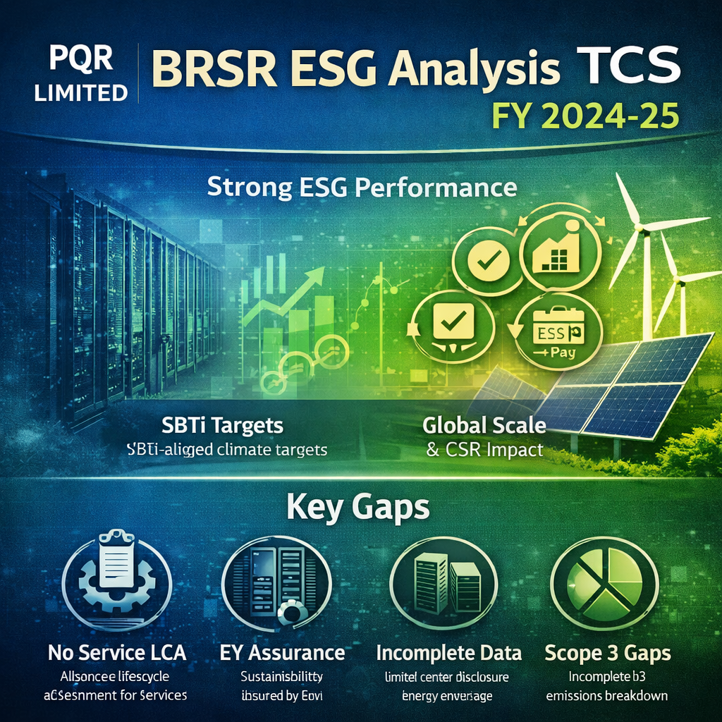 PQR Limited demonstrates strong ESG performance in FY 2024-25, with key highlights including SBTi-aligned climate targets, EY-assured sustainability disclosures, and ESG-linked executive compensation. The company also shows global scale with a large workforce and significant CSR impact. However, certain gaps remain, such as the absence of lifecycle assessment for services, limited transparency in data center energy usage, and incomplete Scope 3 emissions breakdown. While governance and vision are strong, improved operational transparency will be crucial for long-term ESG credibility.